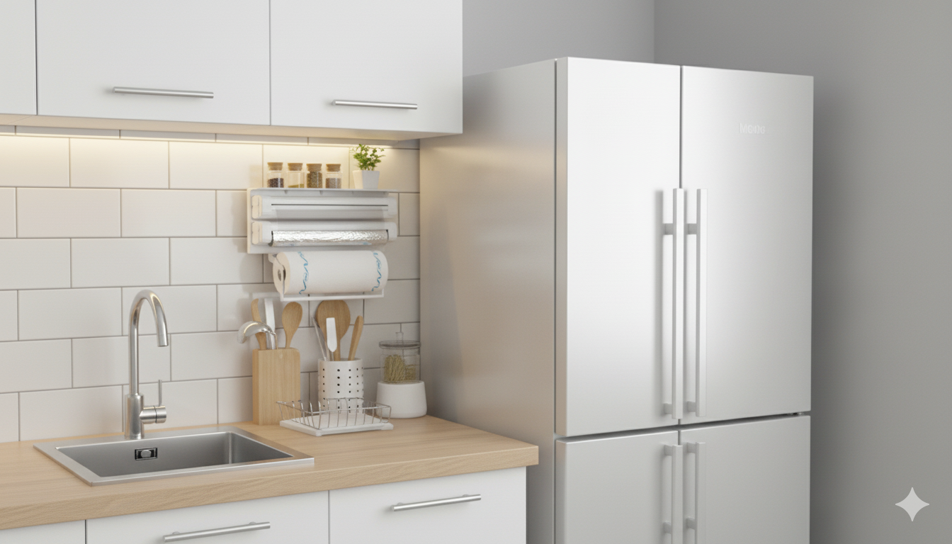 Este organizador de 3 niveles transforma tu espacio de forma instantánea. Diseñado con dispensadores inteligentes que mantienen rollos de papel, film transparente y papel aluminio perfectamente ordenados y siempre a tu alcance.